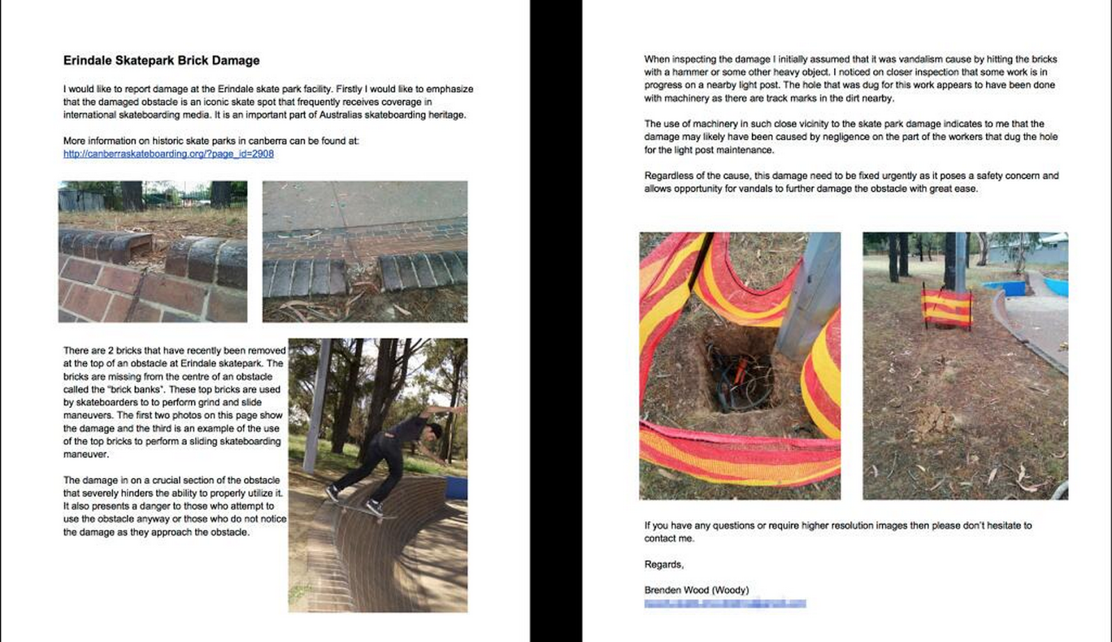 This might not work well in every situation but it’s done the trick in Canberra. Get some other locals on the same page and have them contact the council too. If they’re hearing more than one complaint then they’ll see that there’s actually demand to get your problem fixed. Also, emphasize the positive aspects and/or history of your skatepark to build a case and let them know that it’s worthwhile fixing. The history and heritage of Erindale and Kambah’s facilities have been used in the past to build a case for fixing. See the examples below.