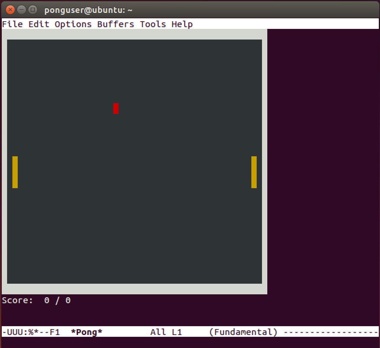Emacs has a few built in games hidden away in the menu. They’re text based and pretty much all single player except for Pong. I guess Emacs Pong is intended to be played by two players sharing the same physical keyboard. Using a shared account, ssh and screen (terminal multiplexer) I was able to adapt it to be a network multiplayer game of sorts. It’s dead simple and easy to cheat by pressing the other players keys but it passed a little time and I figured I’d share it with you all. This is how I did it: